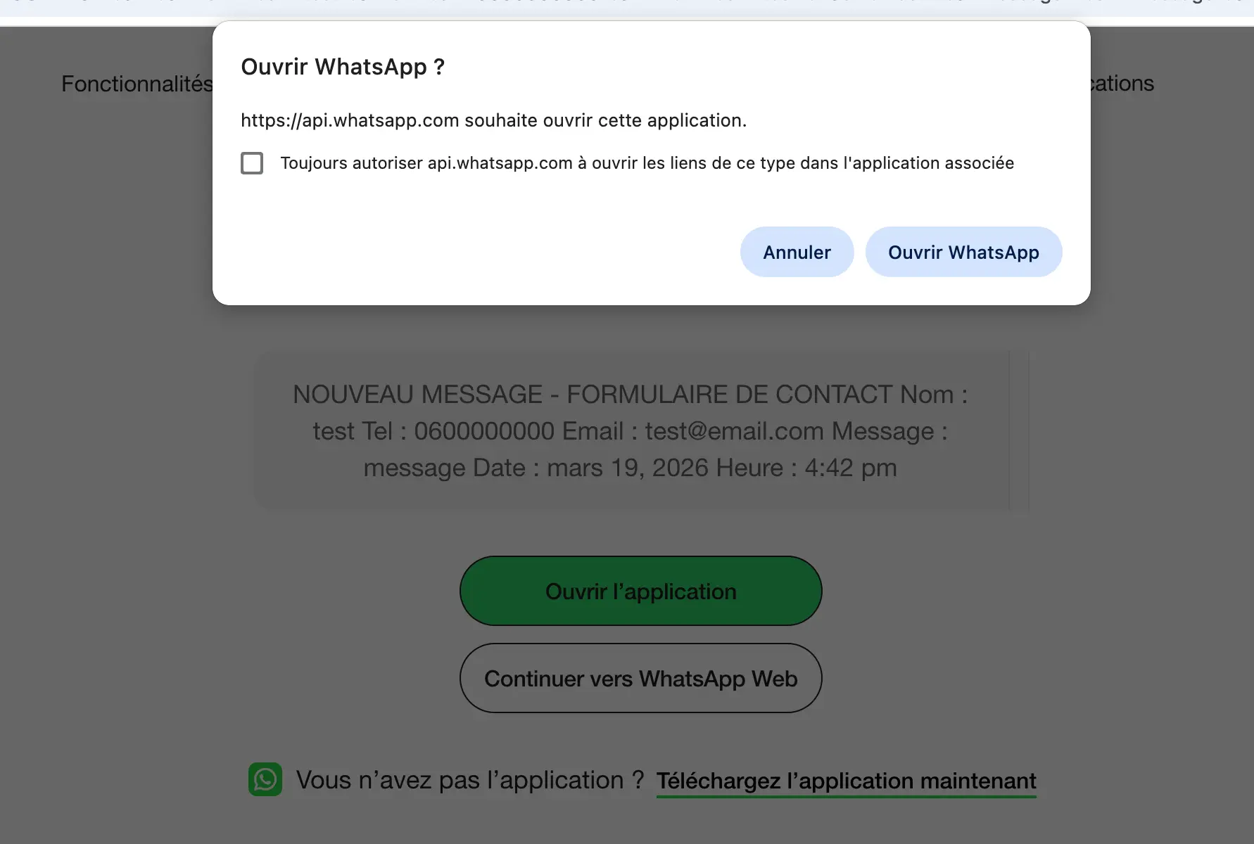 Lorsqu’un utilisateur soumet le formulaire, les données sont envoyées instantanément sur WhatsApp.